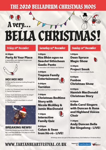 The depths of COVID winter 2020, calls for a bit of Belladrum magic. “A Very… Bella Christmas” brings a little cheer with a Bella Crimbo combo including, live music, storytelling, magic, family shows, a quiz and a Gaelic Panto.